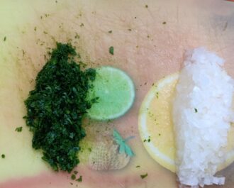 Mientras dejas las papas en la olla express, puedes cortar finamente la cebolla y las hojas del perejil previamente lavado y escurrido.