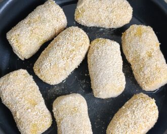 Reserva tus croquetas empanizadas y deja calentando aceite sobre una sartén. Agrega para freírlas y dora bien por cada lado hasta que cambie de color el empanizado.