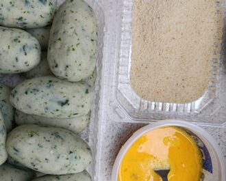 Para empanizar bien tus croquetas de papa, pasa una por una por el huevo, revuelca completamente sobre el pan molido y repite.