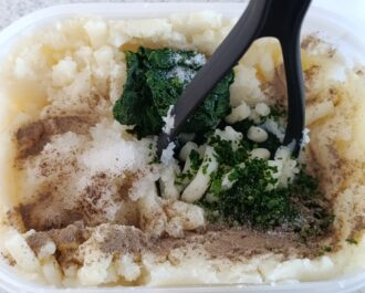 En un bowl coloca las papas tibias y presiona hasta formar un puré. Agrega las espinacas, cebolla y perejil picados finamente, sal y pimienta al gusto. Mezcla bien y prueba que no falte sal.